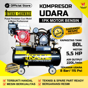 Kompresor Udara Ikame 1 Pk Motor Bensin – Kompresor Udara dalam usaha cuci mobil dan cuci motor biasa dipergunakan untuk : Penggerak hidrolik, karena pengoperasian hidrolik menggunakan angin Menghasilkan busa snowwash / salju, karena penggunaan tabung snowwash juga memakai angin, Proses pengeringan sela-sela kendaraan yang tidak terjangkau oleh lap chamios (dengan air duster gun). Kompesor angin dapat juga digunakan untuk mengisi angin pada ban kendaraan